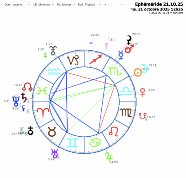 Cependant le grand ∆ d’Eau n’est pas constitué puisque ♄ ♓️ s’en échappe : l’installation du désordre, en pseudo stabilité, n’est pas la meilleure solution pour le moment, les transpersonnelles ♅-♇-♆ agissent de concert pour le changement que ⚸-♂︎-☿ pourraient instaurer intuitivement, les Ego craignent de perdre leurs privilèges et bloquent le processus.