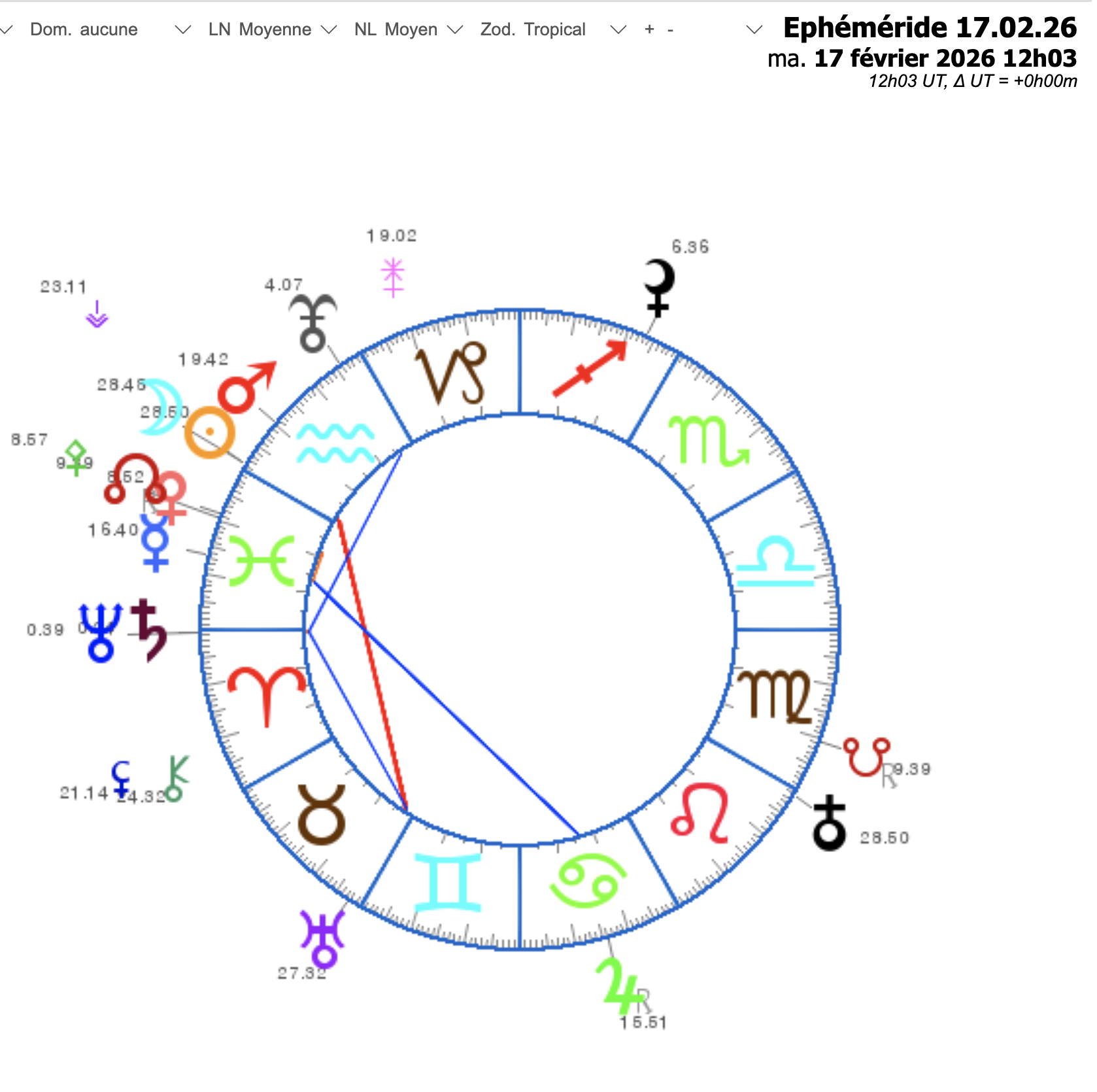 ♄ : saturne ♅ : uranus ♆ : neptune ♇ : pluton ☋ : noeud sud – ☊ : noeud nord
